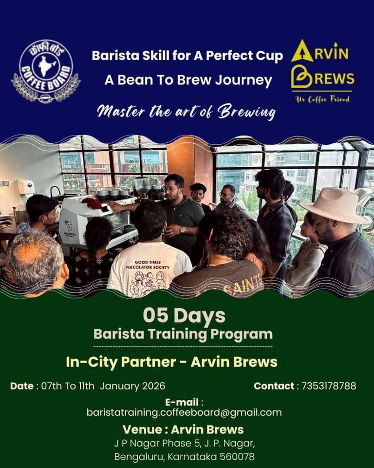 The Coffee Board of India in partnership with Arvin Brews announces a 5-Day Barista Training Program from 7th - 11th Jan 2026! The Program designed to equip you with essential skills in espresso, brewing, and latte art.
