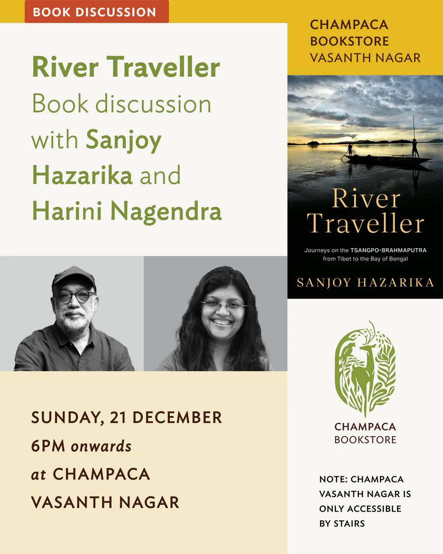 We are delighted to host the Bangalore launch of River Traveller: Journeys on the Tsangpo Brahmaputra from Tibet to the Bay of Bengal by Sanjoy Hazarika at Champaca Bookstore. Join us for an engaging evening where Sanjoy will be in conversation with ecologist and writer Harini Nagendra.