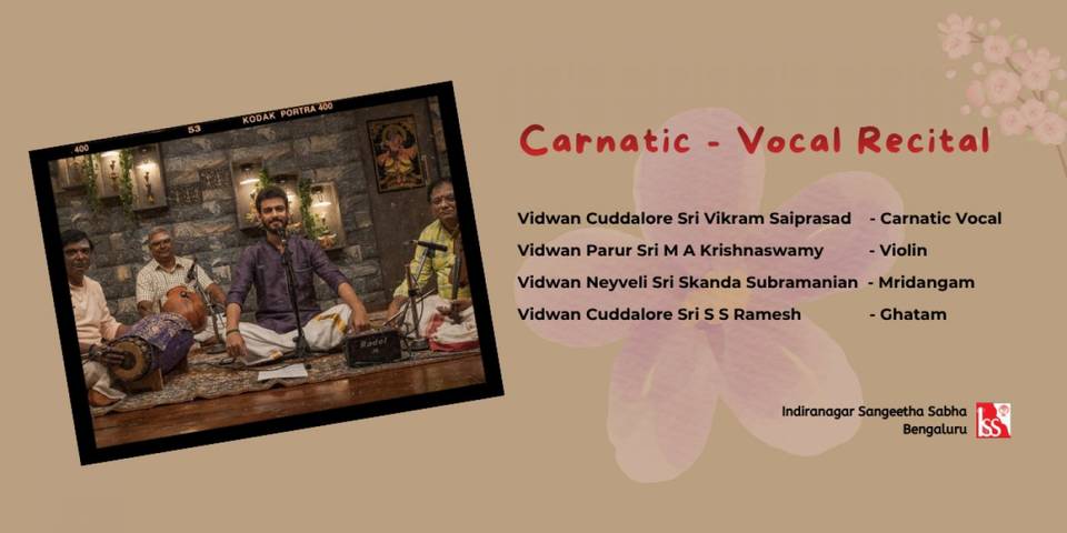 Indiranagar Sangeetha Sabha warmly invites rasikas to an immersive evening of classical music featuring Vidwan Cuddalore Sri Vikram Saiprasad, a vocalist known for his depth, classicism, and emotive delivery. His music blends tradition with finesse, offering listeners a rich and rewarding concert experience.