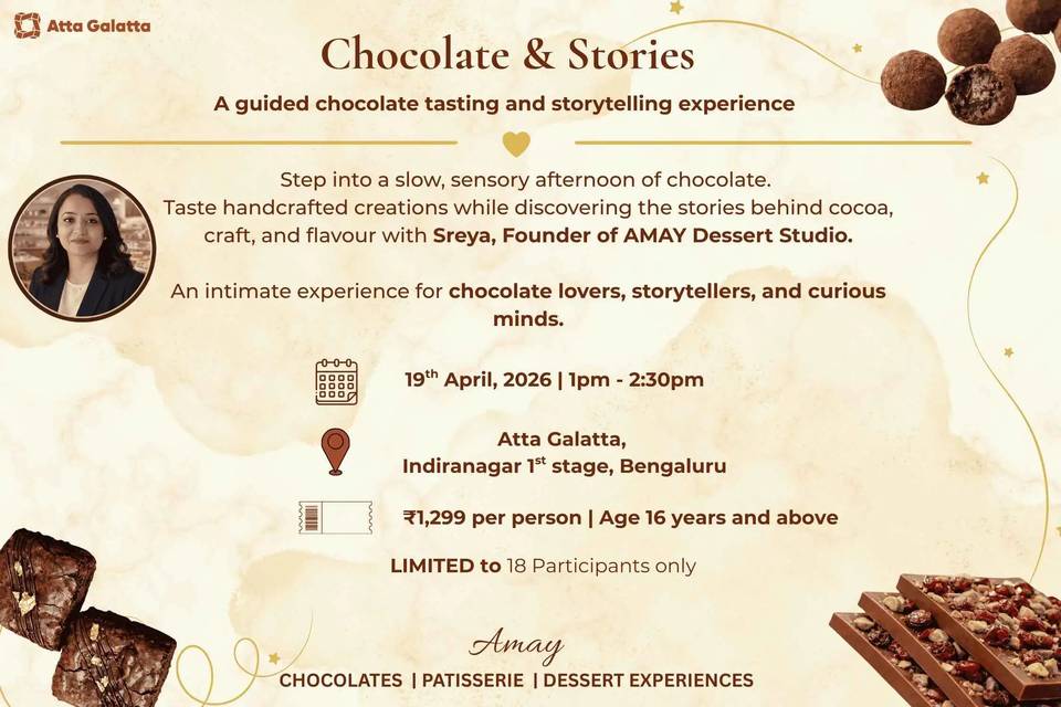 Hosted by Sreya, Founder of AMAY Dessert Studio, this session is designed to be warm, engaging, and experiential — perfect for chocolate lovers and curious minds.