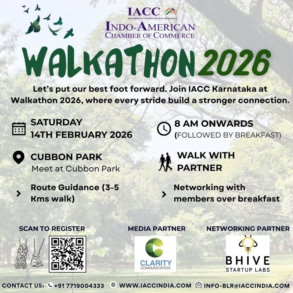 The Indo-American Chamber of Commerce (IACC), Karnataka Chapter, will organise Walkathon 2026 on Saturday, 14 February 2026, at Cubbon Park, Bengaluru. The event will commence at 8:00 AM and will be followed by a networking breakfast.