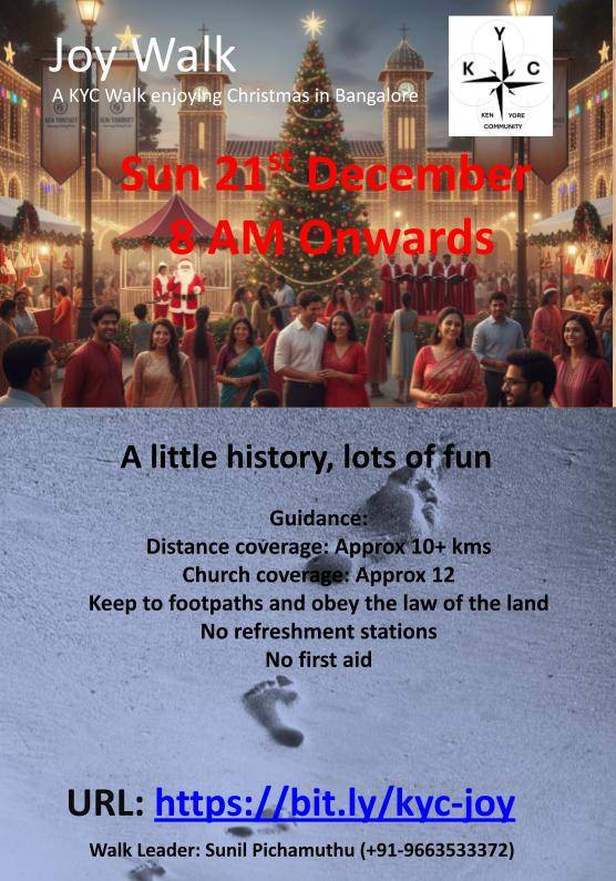 Come and enjoy the JOY of Christmas this year through a KYC JOY Walk in Bangalore covering around 12 churches and other landmarks along the way starting at 8 AM this Sunday the 21st of December.
