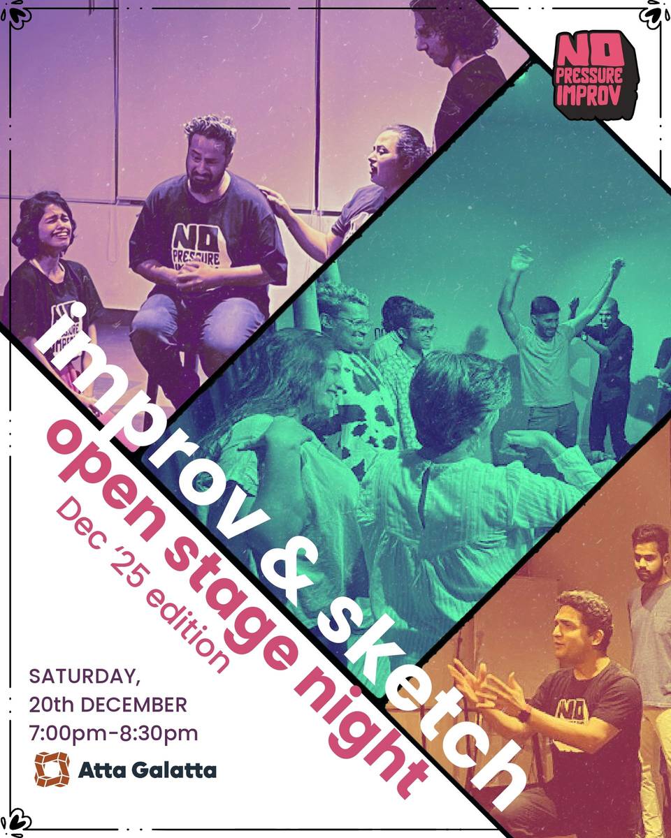 No Pressure Improv returns with the Improv & Sketch Open Stage - think open mics, but for improv (and sketch)! Come watch Bengaluru's bubbling improv scene every month, and sign up if you will, to flaunt your improv on the Open Stage! Up to 8 performers who sign up are put together on the Open Stage to play improv together, led by the jam-master of the evening. This is a great opportunity to get stage time and to play improv in front of a kind and supporting audience, who will be alongside you as you improvise and discover the make-believe. 40 minutes of Open Stage is followed by a featured act in the second half. Bring your ensemble or solo act, improv or otherwise - whether it's storytelling or stand-up or spoken word or your original set of songs - it's the perfect stage for you to experiment with your act or present it to the community.