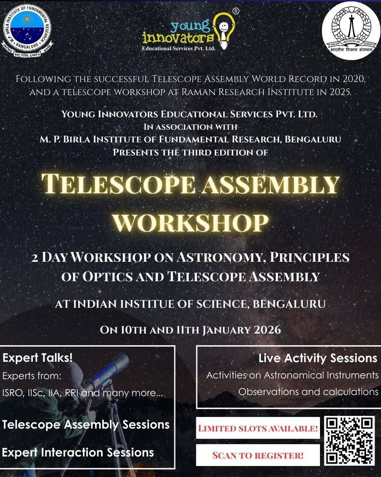 Young Innovators Educational Services Pvt. Ltd. in association with M. P. Birla Institute of Fundamental Research presents the Third Edition of Telescope Assembly Workshop: 2 Day Workshop on Astronomy, Principles of optics and Telescope Assembly. The workshop will be held at the prestigious Indian Institute of Science (IISc), Bengaluru on 10th and 11th January, 2026. This workshop aims to provide foundational knowledge of optics, hands-on experience in building and understanding telescopes and to give exposure to trends in observational astronomy to the participants.
