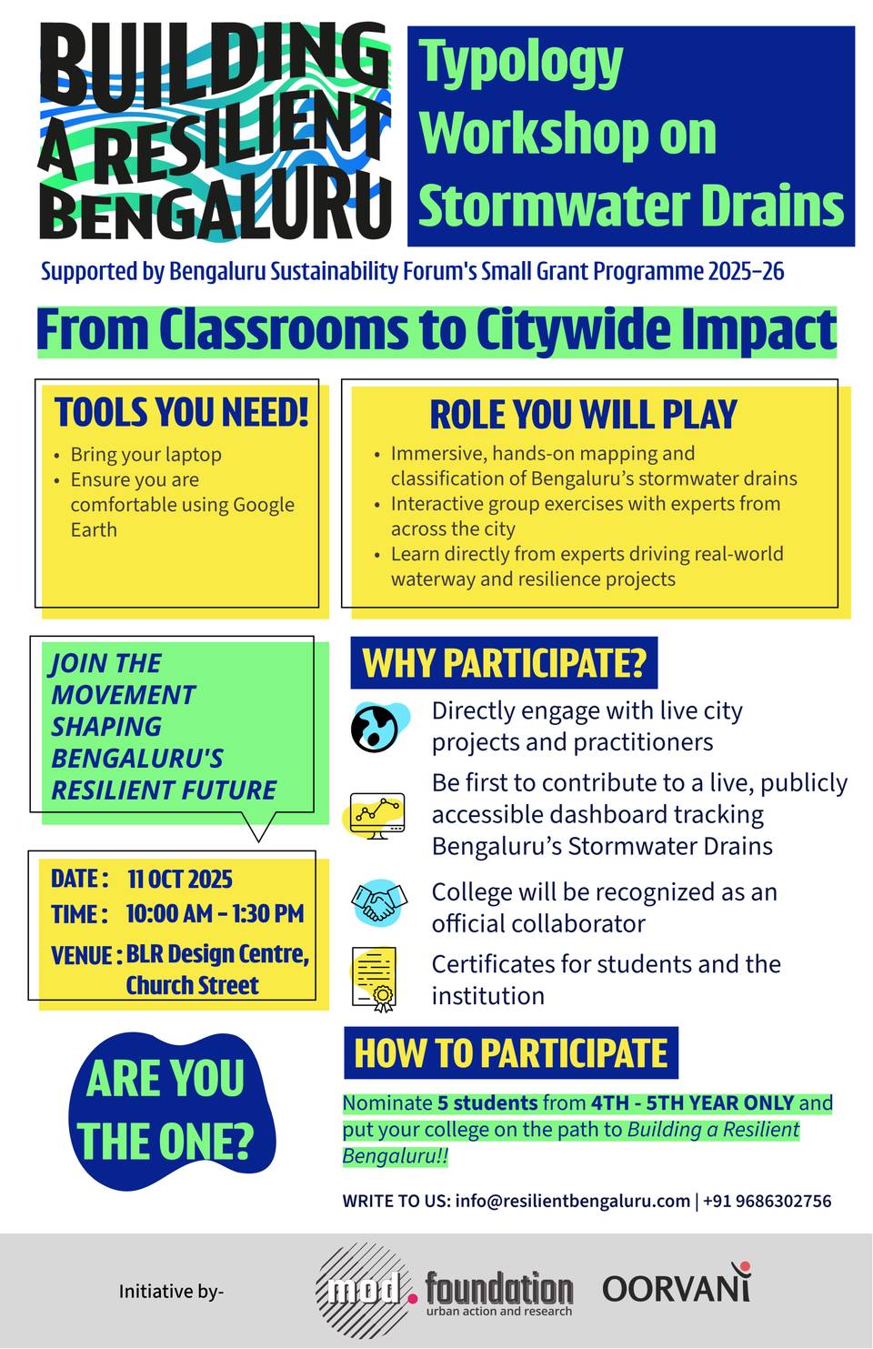 As part of the Building a Resilient Bengaluru initiative, supported by Bengaluru Sustainability Forum, this interactive, hands-on workshop brings together students, researchers, and city practitioners to map and classify Bengaluru’s stormwater drains. Through group exercises and expert-led discussions, participants will help map the typology of drains based on their urban adjacencies — feeding directly into a publicly accessible dashboard that tracks and visualizes the city’s stormwater network.
