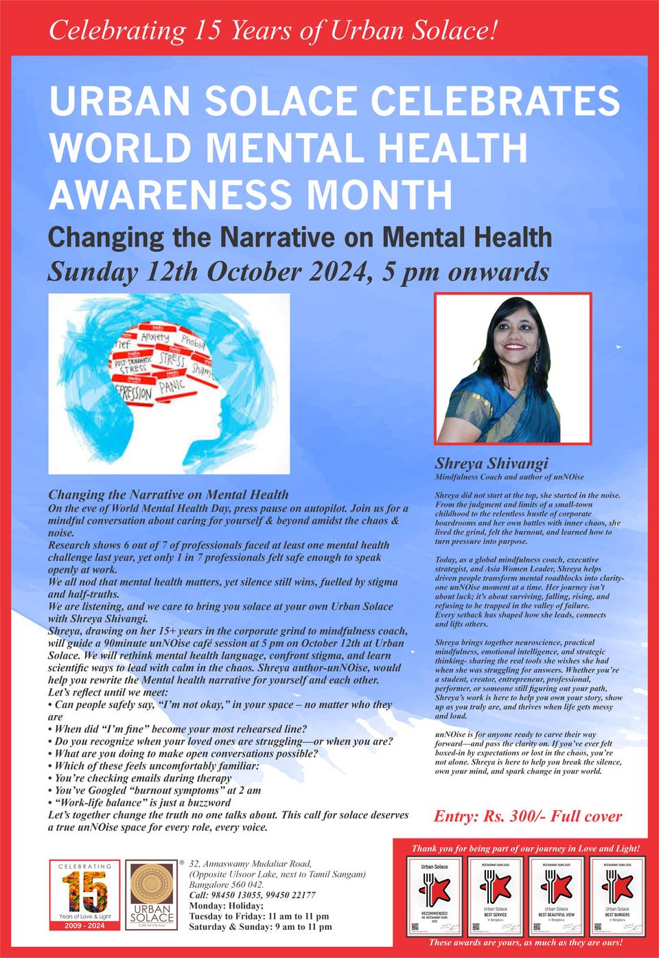 EVENT: URBAN SOLACE CELBTATE WORLD MENTAL HEALTH AWARENESS MONTH DATE: 12-10-2025 TIME: 5 Pm to 7 pm ENTRY: Rs. 300/- full cover VENUE: URBAN SOLACE – CAFÉ FOR THE SOUL ADDRESS: 32 ANNASWAMY MUDALIAR ROAD, BANGALORE 560 042 (OPPOSITE ULSOOR LAKE, NEXT TO TAMIL SANGAM) FOR MORE INFORMATION / TABLE BOOKING AND HOW TO BECOME A PART OF THE CLUB CALL: 98450 13055 / 99450 22177 or Follow us on Facebook: Urban Solace – Café for the Soul & Instagram: myurbansolace FREE TICKETS AVAILABLE ON BOOK MY SHOW AND DISTRICT ------------------------------------------------------------------------------------------------------------------------------------------ URBAN SOLACE CELEBRATES WORLD MENTAL HEALTH AWARENESS MONTH Shreya Shivangi Mindfulness Coach and author of unNOise Shreya did not start at the top, she started in the noise. From the judgment and limits of a small-town childhood to the relentless hustle of corporate boardrooms and her own battles with inner chaos, she lived the grind, felt the burnout, and learned how to turn pressure into purpose. Today, as a global mindfulness coach, executive strategist, and Asia Women Leader, Shreya helps driven people transform mental roadblocks into clarity- one unNOise moment at a time. Her journey isn’t about luck; it’s about surviving, falling, rising, and refusing to be trapped in the valley of failure. Every setback has shaped how she leads, connects and lifts others. Shreya brings together neuroscience, practical mindfulness, emotional intelligence, and strategic thinking- sharing the real tools she wishes she had when she was struggling for answers. Whether you’re a student, creator, entrepreneur, professional, performer, or someone still figuring out your path, Shreya’s work is here to help you own your story, show up as you truly are, and thrives when life gets messy and loud. unNOise is for anyone ready to carve their way forward—and pass the clarity on. If you’ve ever felt boxed-in by expectations or lost in the chaos, you’re not alone. Shreya is here to help you break the silence, own your mind, and spark change in your world. Changing the Narrative on Mental Health On the eve of World Mental Health Day, press pause on autopilot. Join us for a mindful conversation about caring for yourself & beyond amidst the chaos & noise. Research shows 6 out of 7 of professionals faced at least one mental health challenge last year, yet only 1 in 7 professionals felt safe enough to speak openly at work. We all nod that mental health matters, yet silence still wins, fuelled by stigma and half-truths. We are listening, and we care to bring you solace at your own Urban Solace with Shreya Shivangi. Shreya, drawing on her 15+ years in the corporate grind to mindfulness coach, will guide a 90minute unNOise café session at 5 pm on October 12th at Urban Solace. We will rethink mental health language, confront stigma, and learn scientific ways to lead with calm in the chaos. Shreya author-unNOise, would help you rewrite the Mental health narrative for yourself and each other. Let’s reflect until we meet: • Can people safely say, “I’m not okay,” in your space – no matter who they are • When did “I’m fine” become your most rehearsed line? • Do you recognize when your loved ones are struggling—or when you are? • What are you doing to make open conversations possible? • Which of these feels uncomfortably familiar: • You’re checking emails during therapy • You’ve Googled “burnout symptoms” at 2 am • “Work-life balance” is just a buzzword Let’s together change the truth no one talks about. This call for solace deserves a true unNOise space for every role, every voice.