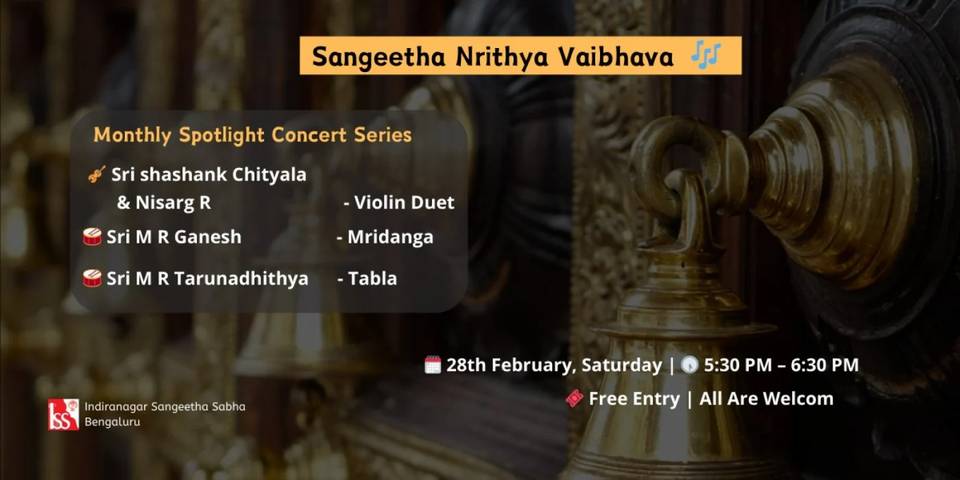 Celebrate the next generation of Indian classical talent as Indiranagar Sangeetha Sabha, Bengaluru, presents the third edition of its Sangeetha Nrithya Vaibhava – Monthly Spotlight Concert Series. This special showcase features promising young artistes from the School of Performing Arts, bringing fresh energy and refined artistry to the classical stage.